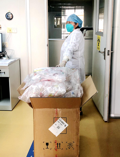 面对从四市三区各医疗单位24小时不定时送来的样品,不管白天黑夜,黄妙琳拎着沉重的送样箱,健步如飞,穿梭在实验室长长的走廊。她以最快的速度把样品处理好,马上送到核心实验室,为防控疫情争取了时间。她经常笑着说:“疫情期间,我的手臂最少粗了几圈”。每天收样室忙得像个菜市场,她真恨不得自己有三头六臂,一会儿收样,一会儿协调分发采样物资,一会儿回答送检单位的疑问,同样的话她每天都要重复许许多多遍,整天下来声音已经沙哑,手也因为用力过度而发抖。但她时刻保持高昂的斗志,慎终如始,不麻痹,不厌战,不松劲,严防死守至“疫”止。
