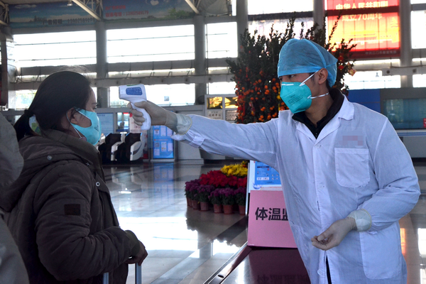图2、号手陈斌鸿在汽车总站 检测来往旅客体温