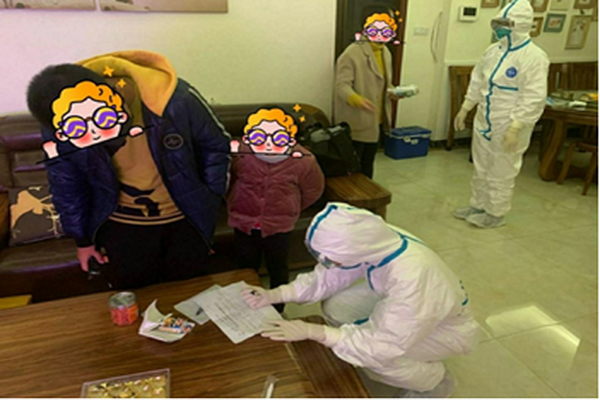 图3.省级青年文明号副号长李一鹏、市级青年文明号号长李艳清、副号长梁东兴、号手黄凤娟在定点医院调查疑似病例资料