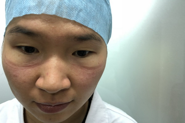 3岁的儿子发现,妈妈变得有些陌生。儿子是从微信视频上见到妈妈张冬合的。因长时间穿戴防护服工作,她的脸上被勒出了深深的印痕,从大年初二至今,儿子都是以这样的方式跟妈妈见面。
