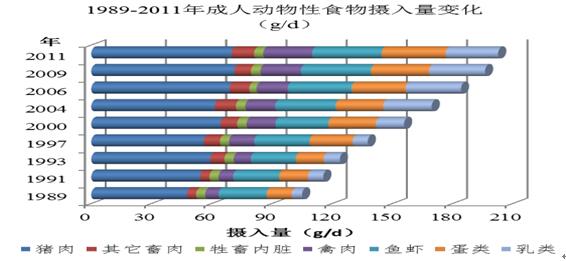 中国健康与营养调查(CHNS)显示,从1989年到2011年,动物性食品摄入量逐年升高,畜肉、禽和鱼虾类都有较大提高。