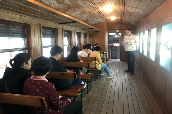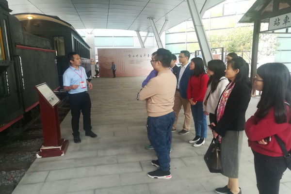 图3、党员在听讲解员介绍台山新宁铁路建造历史