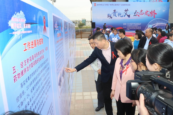 赖燕芬副市长启动2019年江门市区“践责抗艾 众志成桥”艾滋病防治公益宣传活动后,首先慰问了活动现场的市疾控中心艾滋病防治一线工作人员,送上慰问品,并一一亲切握手并致问候。