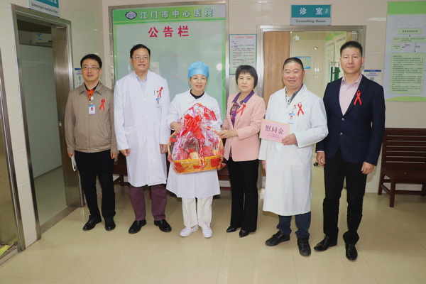 慰问组首先来到感染科的健康咨询门诊,现场视察市区艾滋病抗病毒治疗“一站式服务”的工作环境,了解相关工作情况,并向奋战在“抗艾”一线的医务工作者致以诚挚问候,鼓励他们再接再厉,用心为艾滋病患者提供更好的医疗服务,为推进“健康江门”作出更大的贡献。