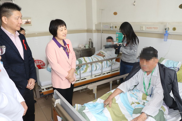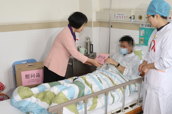 在感染科病房里,赖燕芬副市长看望了两名艾滋病患者,详细询问患者的身体和生活状况,并向他们赠送慰问金及生活用品,鼓励他们积极面对生活、勇敢面对疾病,共享阳光与欢乐。