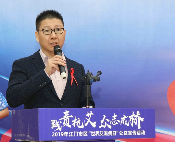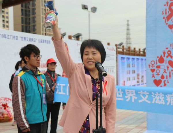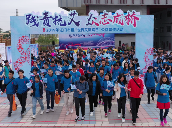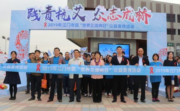 在12月1日第32个世界艾滋病日来临之际,由江门市人民政府防治艾滋病工作委员会主办的2019年江门市区“践责抗艾 众志成桥”艾滋病防治公益宣传活动启动仪式于11月9日在江门演艺中心广场隆重举行。市防艾委成员单位、市防艾办、蓬江区艾防办、江海区防艾办、卫生健康系统、市区各院校、广大市民以及义工约400余人参加了本次活动。江门市人民政府副市长赖燕芬出席本次活动并鸣叭开赛,江门市卫生健康局党组主要负责同志蓝敏雄副书记、副局长为活动致辞。